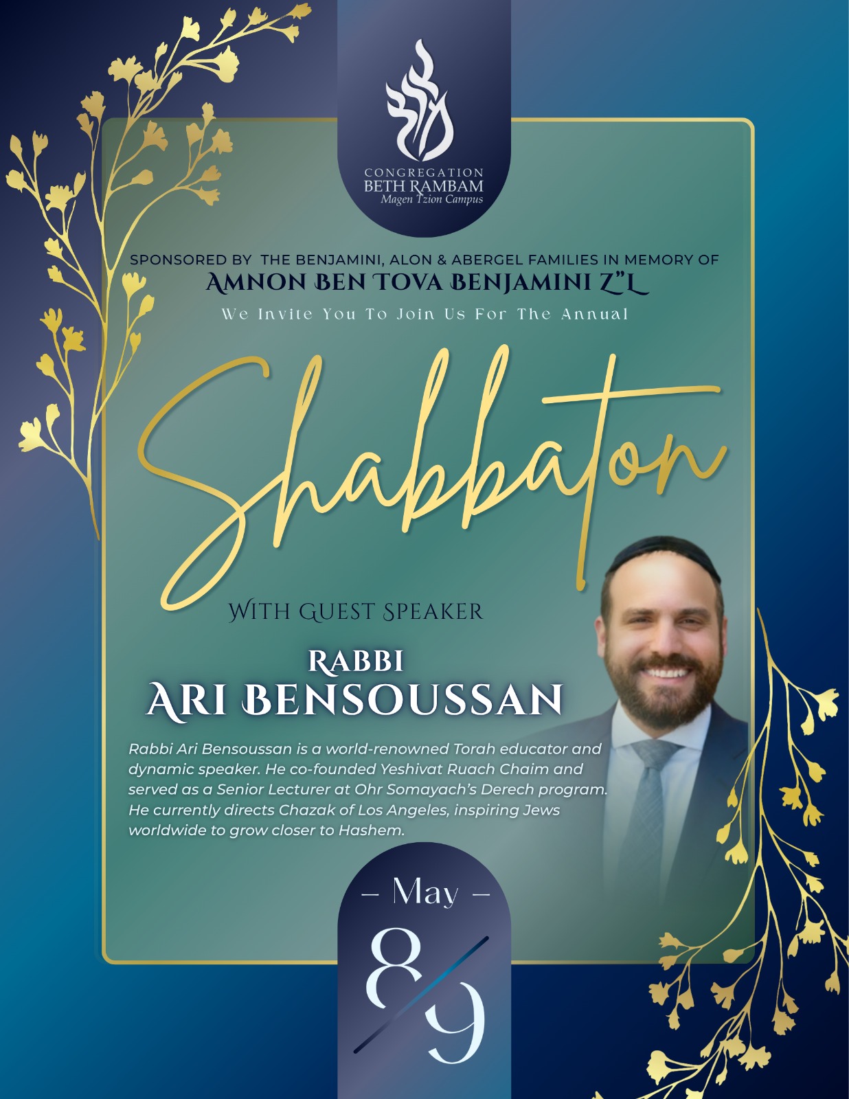 Experience an uplifting and inspiring Shabbat with Ari Bensoussan—filled with meaningful learning, connection, and warmth.